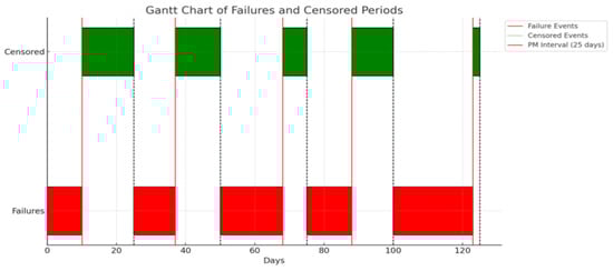 Suppose we are operating a component, under the assumption that this component maintenance program is in place, employing a calendar-based schedule with a preventive maintenance (PM) cycle of 25 calendar days, this program was decided according to initial guesstimates about preventive and failure/corrective operations’ cost. Additionally, we are assuming there is no significant downtime for either preventive or corrective maintenance, or, in other words, we disregard it in comparison to the time between maintenance operations. After 120 days of operation (starting 1 January), a specific number of failure incidents (measured in operating time to failure in days) and preventive replacements (measured in operating time to replacement in days) have been recorded.
