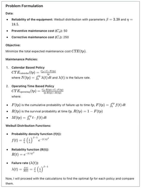 Generative AI not only helps optimize maintenance policies but also offers a suite of other capabilities. It can adapt existing models to specific constraints, explore alternative formulations for finite or infinite time periods, and generate insightful visualizations of the output, allowing decision-makers to better understand the implications of various maintenance strategies []. Moreover, AI-assisted models can suggest innovative ways to overlap different policies, combining and creating hybrid strategies tailored to specific operational needs []. Therefore, the novelty of this research lies in the application of generative AI to dynamically model, optimize, and interact with maintenance policies. Specifically, the research demonstrates how generative AI can accomplish the following: