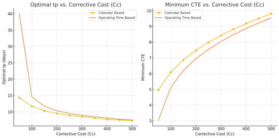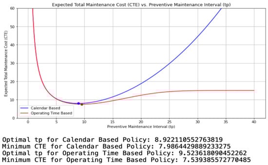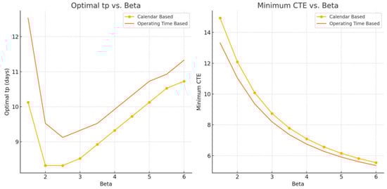 - Minimum CTE vs. β: This graph illustrates how the minimum expected total maintenance cost (CTE) varies with different values of β. The operating time-based policy consistently results in a lower minimum CTE compared to the calendar-based policy across the range of β values.
