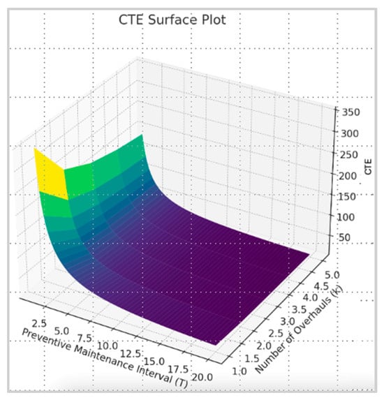 One of the most prevalent optimization criteria in maintenance policies is the minimization of costs. This criterion involves reducing the total expected cost of maintenance over a specified period, considering both preventive and corrective maintenance actions. For example, in the age-dependent preventive maintenance policy discussed by [], the goal is to find the optimal replacement age TT that minimizes the combined cost of scheduled replacements and unscheduled failures. Similarly, ref. [] focus on minimizing maintenance costs by determining the optimal intervals for preventive maintenance and the degree of repair required after failures.