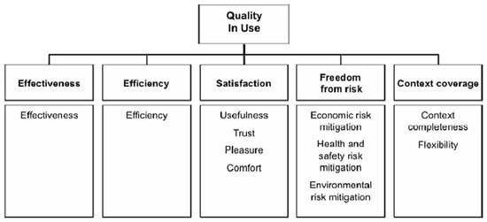 With this in mind, we have dipped into the ISO 25000 series (SQuaRE—System and Software Quality Requirements and Evaluation) [], specifically into the 25010 series (Quality Model Division). ISO 25010 proposes the following criteria to be analyzed to evaluate a code, concerning the possible outcomes resulting from the interaction with it, within its “Quality in Use” model (see Figure 9 and some examples of applications in [] or []):