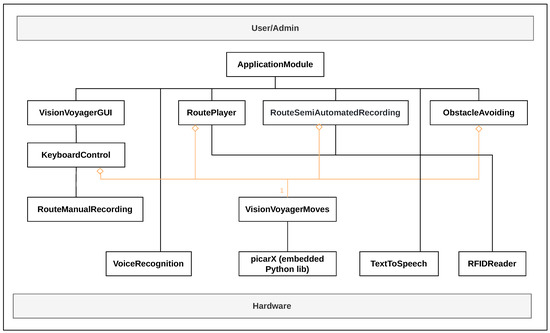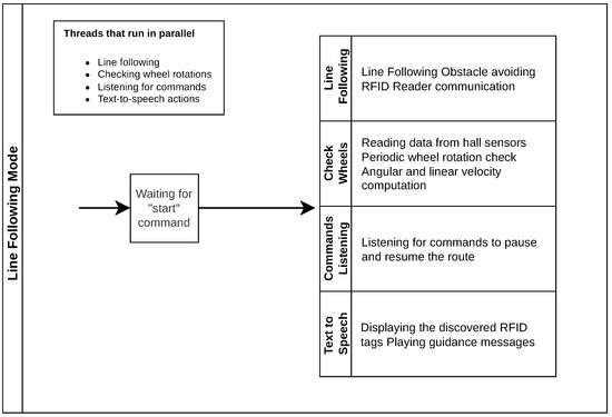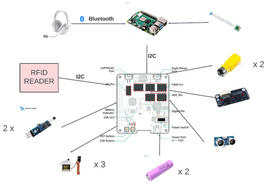 The hardware architecture follows the layered approach presented in the previous section. The first layer, the one that commands and processes all the data, is built around a Raspberry Pi 4, i.e., the central processing element of the system. The second layer, responsible for mobility support, is represented by the SunFounder robot’s hardware at the top (HAT) of Raspberry Pi 4. The HAT plays an intermediary role between the first and last layers, being controlled by the Raspberry Pi and, in turn, controlling the motors and sensors. The last layer is represented by the sensing and action layers. It is the one that interacts with the environment and is composed of ultrasonic detection sensors, a grayscale sensor, two hall sensors, and the headset, but also includes motors, servomotors, and, the most complex piece of this layer, the RFID reader.