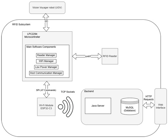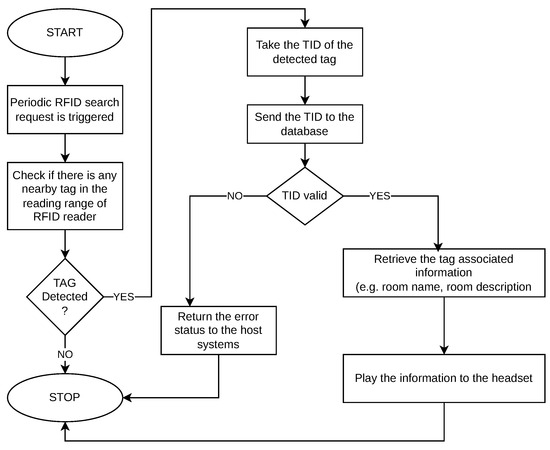 Another important component of the proposed solution is represented by a custom-made RFID subsystem, which is shown in Figure 3. The subsystem is responsible for detecting the preregistered location passive RFID tags, identifying them, and retrieving the associated information regarding the location from the database. The following main circuits compose the RFID subsystem:
