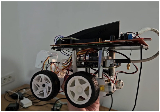 Regarding the robotic hardware controlled by Raspberry Pi 4 Model B, we choose the PiCar-X kit from SunFounder, as it includes some of the components necessary for the proposed system, namely a camera, motors and wheels for movement, servomotors for steering and the camera’s two-axis movement, an ultrasonic sensor, a grayscale sensor, and a multifunctional expansion board: the robot HAT. In addition to the components included in the kit, we have also add two Hall effect sensors to monitor the rotation of the rear wheels.