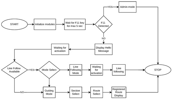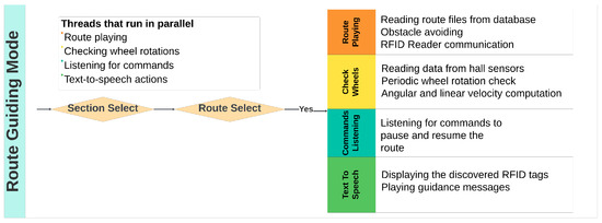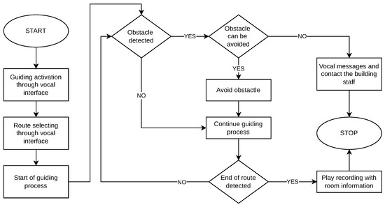 The route playback and guiding mode implies the following scenario. Each user will start from an origin location, , as defined in Section 3. In each origin location, there will be a prototype of the Vision Voyager robot, with pre-recorded routes from location to . Using vocal commands, a user will turn on a robot and choose one location from the options presented by the vocal menu (one option between –). The system will play back the routes while vocally guiding the user using repetitive sounds like beacons together with vocal commands (i.e., turn left, go forward, and stop). During route playback and guiding, the system is also responsible for detecting the points of interest and for playing back the information related to each point.