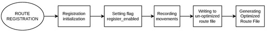 As mentioned in the previous sections, the system relies on a set of predefined routes. Route recording is responsible for capturing and storing the movements required to follow that fixed route. The process of registering a new route into the menu and recording it is depicted in Figure 5.