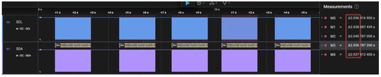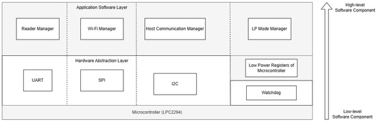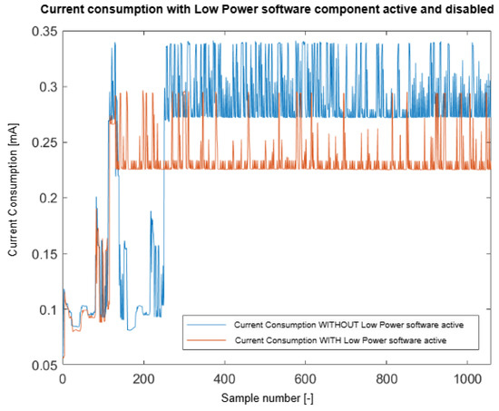 In Figure 19, the current consumption results are presented. It can be observed that there is a slight improvement regarding power consumption when the Low-Power Mode Manager component is enabled, even if the “Low-Power” mode implementation targets only the microcontroller, which enters sleep mode when there is no external request to be performed. This means the RFID and Wi-Fi modules are still awake, running their internal algorithms. In the mentioned diagram, this behavior can be easily noticed by observing the periodic spikes in the measurements (in both cases).