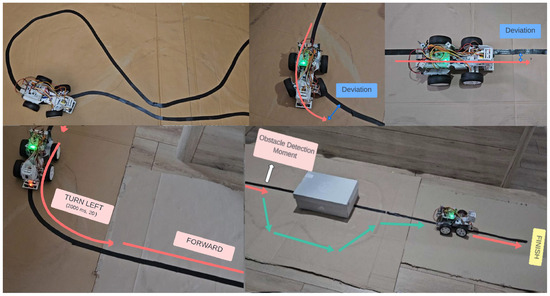 The obstacle detection tests show that the robot detects obstacles most of the time, but occasionally (in less than 5% of cases), it detects them too late to react in time due to how the threads interact. Meanwhile, an obstacle-avoiding accuracy > 60% means that in at least two out of three cases, the robot successfully avoids the obstacle. However, sometimes, it gets stuck by detecting a new obstacle, for example, when it is too close to a wall while performing the avoidance manoeuvre. The deviation refers to being 5% to 10% further than the point where the robot would have reached if there were no obstacles. The deviation and failure to avoid the obstacle also occur due to the robot’s position and angle after the maneuver, which can block the path.