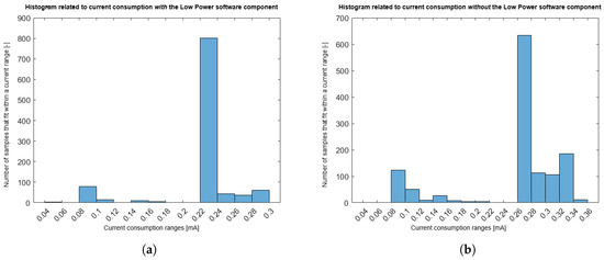 (a) Current consumption distribution with the software component “Low-Power Manager” enabled. (b) Current consumption distribution with the software component “Low-Power Manager” disabled.