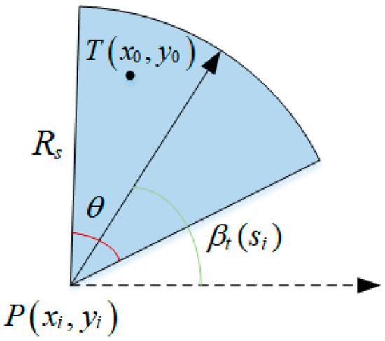 where represents the position coordinates of the node, represents the sensing angle, represents the sensing radius, and represents the current working direction. represents the target point located within the sector sensing area.