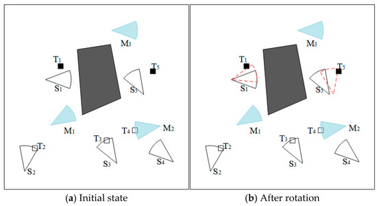 Figure 2 shows the operation of rotating stationary sensors. There are five targets , one obstacle, five stationary non-rechargeable sensors , and three mobile rechargeable sensors in the monitoring area. The target is covered by sensors, and only are with coverage holes. are in the vicinity of uncovered targets . After determining the coverage hole, the stationary sensor is rotated to repair the hole. As shown in the figure, after rotation, the position of has changed, and all targets are covered by sensors.