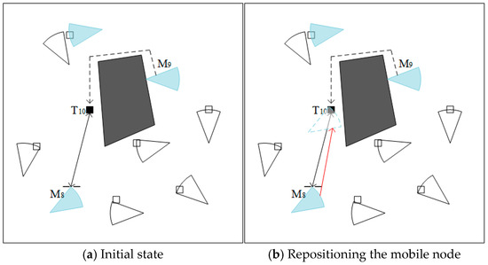 There are two cases for scheduling mobile nodes. Case 1 is shown in Figure 3. There are four targets , one obstacle, three stationary non-rechargeable sensors , and three mobile rechargeable sensors in the monitoring area. Targets are covered by sensors, and only is a coverage hole. are the two closest mobile sensors to the coverage hole. They can all serve as candidate nodes for repairing holes. In order to reduce mobile energy consumption, it is necessary to compare the Euclidean distance between two sensors, and, if , the mobile node is chosen to repair the hole. Apart from distance factors, the remaining energy of nodes can also affect the selection of candidate nodes. If the remaining energy is insufficient to meet the requirements, candidate nodes need to be re-selected.