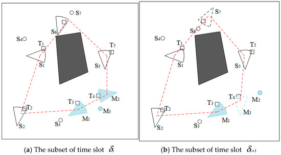 After coverage enhancement, the monitoring quality of the system has been greatly improved. All target points are covered. However, there is still a problem of redundant coverage in the network. In order to reduce resource waste caused by redundancy, some sensor nodes can be arranged to sleep to reduce unnecessary energy consumption. In any time slot , only one subset that meets the coverage requirements needs to be activated to perform the monitoring task normally. Different subsets need to be activated for different tasks. As shown in Figure 5, in time slot , the working subset is . In time slot , the working subset is .