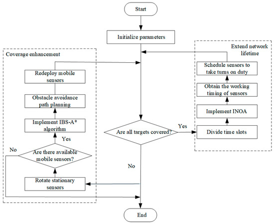 Our research proposes a new approach to address the challenges of coverage quality and network lifetime in obstacle environments. This method consists of three important steps: rotating stationary nodes; updating the location of mobile nodes and repairing coverage holes; and scheduling node sleep to prolong the network lifetime. Firstly, we determined the geometric length from coverage holes and the stationary nodes and optimized the working direction of nodes that meet the conditions. Then, based on the improved bidirectional search A* algorithm (IBS-A*), the shortest obstacle avoidance moving path was solved, and the position of the mobile node was updated. By optimizing the sensing direction and position of nodes, the task of repairing coverage holes was completed to enhance network coverage. Finally, the improved nutcracker optimizer algorithm (INOA) was used to solve the optimal working sequence of the nodes. Each subset corresponds to a time period. This method avoids unnecessary energy waste and can extend the lifetime of the network. Figure 6 shows the framework and steps of our method.