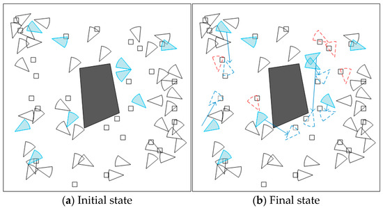 Figure 7 shows a visualization example after executing the coverage enhancement algorithm. Figure 7a is a monitoring area where sensors are randomly deployed, and Figure 7b is the state after executing our algorithm. The white rectangle and sector are the target and stationary nodes, respectively. The blue sector is the mobile sensor node. The black polygon represents obstacles. The red dashed sector represents the new position of the static sensor after rotation. The blue dashed sector represents the new position of the mobile sensor. The blue arrow represents the movement path of the mobile sensor. From Figure 7a, it can be seen that there are 13 uncovered targets. After executing the algorithm, there are only two uncovered targets in the monitoring area. Therefore, implementing the method proposed in this paper can effectively repair coverage holes and enhance network coverage.