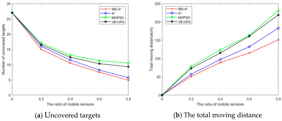From Figure 8, when the proportion of mobile sensors becomes larger, the uncovered targets show a decreasing trend, while the moving distance shows an increasing trend. As shown in Figure 8a, in terms of uncovered targets, the results of IBS-A* are very close to those of A*, MOPSO, and the VB-IVFA. When the proportion of mobile sensors reaches a certain value, all targets in the monitoring area are covered by the sensors. But, in Figure 8b, our algorithm has a significant advantage in terms of movement distance. The A*-based method can search for the most suitable path, but its performance is poor in obstacle environments. However, the obstacle avoidance paths planned by the MOPSO algorithm and the VB-IVFA have many turning points and are not smooth enough. Also, our method has good obstacle avoidance ability, and the path is relatively smooth. Therefore, the moving distance generated by the above three algorithms is higher than our method. With A*, MOPSO, and the VB-IVFA, the IBS-A* method reduces the total moving distance by 10.5%, 23.1%, and 18.3%, respectively.