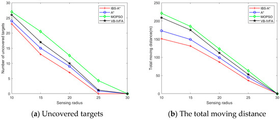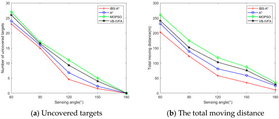 Figure 9 and Figure 10, respectively, demonstrate the performance of four algorithms under different sensing radii and angles. As shown in Figure 9a and Figure 10a, in terms of uncovered targets, all algorithms exhibit a decreasing trend. When the perceived radius and angle increase to a certain extent, the performance of the four algorithms is very similar. In terms of moving distance, it is evident from the analysis of the experimental data in Figure 9b and Figure 10b that the proposed IBS-A* has the smallest moving distance, followed by the VB-IVFA, and MOPSO has the highest value. This indicates that the proposed method has less mobile energy consumption while meeting coverage requirements, which is more conducive to extending the network lifetime.