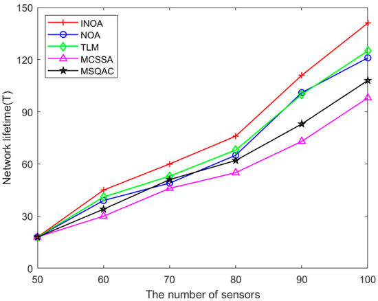 The network lifetime of five algorithms under different sensor numbers is shown in Figure 11. Experimental parameters: , , and are set as 50, 10 m, and, respectively. The proportion of mobile sensors is 0.2, and is 50–100. By analyzing the experimental data in Figure 11, it is evident that, as the number of sensors enhanced from 50 to 100, the network lifetime also continued to rise. More sensors mean that multiple sensors can be deployed at certain targets. Therefore, more work subsets that meet coverage requirements can be obtained. The more subsets that meet the criteria, the longer the network lifetime. Compared to the TLM, MSQAC, and MCSSA, the proposed INOA method has a longer network lifetime. Under the same conditions, compared with the TLM, MSQAC and MCSSA, the maximum improvement of the INOA is 12.8%, 30.6%, and 43.9%, respectively, and the average improvement is 5.9%, 15.8%, and 22.3%, respectively. Compared to the NOA, the INOA has a maximum increase of 16.3% and an average increase of 8.7%. Compared with the NOA, the INOA has added a Cauchy mutation operator and fusion improvement strategy, which enriches the diversity of the population and improves the global optimization ability of the algorithm. Therefore, the lifetime of the subset of nodes obtained by the INOA is longer.