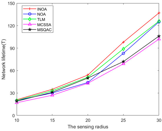 The network lifetime of five algorithms under different sensing radii is shown in Figure 12. , , and are set as 50, 50, and, respectively. The proportion of mobile sensors is 0.2, and is 10–50 m. As shown in Figure 12, the network lifetime of all five algorithms shows an upward trend. The larger the value of the sensing radius, the larger the coverage range of the sensor node. Sensors with larger coverage areas can cover more targets. Therefore, fewer sensors are used to perform monitoring tasks, thereby extending the network lifetime. The sensing radius of the sensor reached beyond 20 m, showing that the improvement in network lifetime is more significant. With the NOA, compared to the TLM, MSQAC, and MCSSA, the INOA has always had the best network lifetime.