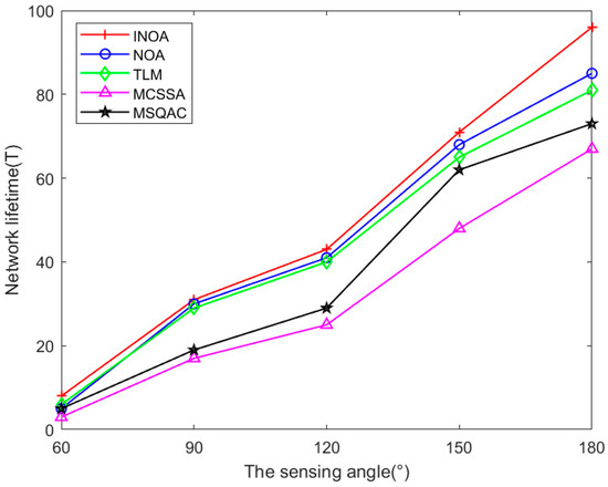 We compared the performance of the proposed INOA with NOA, TLM, MSQAC, and MCSSA algorithms in network lifetimes. We implemented five algorithms in the case of different numbers of sensors , sensing radius , sensing angle , and target .