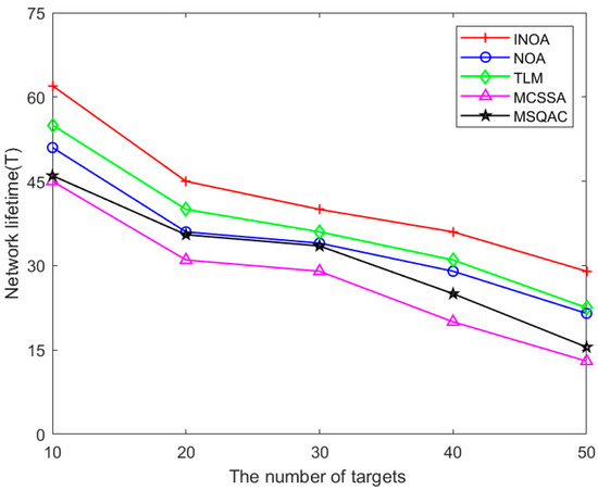 The network lifetime of five algorithms under different numbers of targets is shown in Figure 14. , , and are set as 100, 10 m, and, respectively. The proportion of mobile sensors is 0.2, and the number of targets is 10–50. The increase in targets means that more sensors need to be scheduled to perform monitoring tasks, which requires more energy consumption. The lifetime of the network is negatively correlated with target numbers. From the experimental data in the figure, it can be seen that, when the number of targets is the same, the INOA has the longest network lifetime. Compared to the NOA, TLM, MSQAC, and MCSSA, the average improvement of the INOA proposed is 14.7%, 13.6%, 45.3%, and 56.1%, respectively.