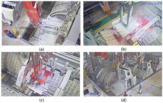 Aluminum electrolysis operations: (a) shell-breaking mechanisms fragmenting the old anode, (b) the anode grabbing rod extracting the old anode from the aluminum electrolytic cell, (c) the bucket scooping out the anode residue from the aluminum electrolytic cell, and (d) the process of the feeding pipe spraying alumina powder onto the surface of the new anode.