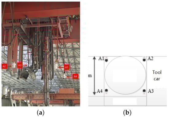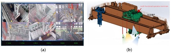 The high-resolution camera surveillance system for aluminum electrolysis operations. During the operation of the crane, the camera automatically tracks the vertical movements of the multi-functional operation terminals to capture superior monitoring footage. (a) Monitoring view of the aluminum electrolysis operation environment. (b) Deployment of high-resolution cameras.