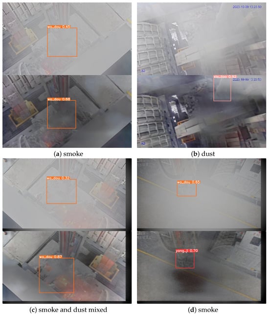 Figure 3, Figure 11 and Figure 14 all showcase the inference results of YOLOv8n-Al-Dehazing in aluminum electrolysis smoky environments. The results in Figure 3 demonstrate that YOLOv8n-Al-Dehazing has the capability to detect operational targets in scenarios involving mist, smoke, and fog. The results in Figure 11 show that YOLOv8n-Al-Dehazing can perform object detection tasks in varying concentrations of smoke and dust, which demonstrates that the 4KDehazing algorithm effectively addresses image degradation issues in such complex environments, enabling the monitoring system to operate stably under various adverse conditions. It highlights the algorithm’s potential to facilitate round-the-clock surveillance with consistent reliability. The results in Figure 14 illustrate that YOLOv8n-Al-Dehazing addresses issues such as false positives and missed detections encountered by YOLOv8n in smoky conditions, achieving superior results in most scenarios.