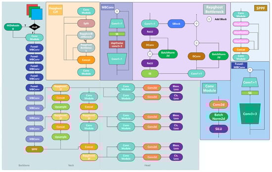 To mitigate the significant impact of high-resolution images on the computational performance of YOLOv8n, we improve it through the incorporation of EfficientNetV2. EfficientNetV2 is an improvement over EfficientNet [41], incorporating a joint scaling strategy in its design as shown in Figure 7. Compared to traditional lightweight methods for object detection, EfficientNetV2 introduces a progressive scaling strategy. This approach begins training with smaller resolutions and shallower networks, gradually increasing both resolution and depth as training progresses. The progressive scaling strategy significantly accelerates the training speed, enabling the model to converge more rapidly, particularly when handling high-resolution images. Additionally, the Fused-MBConv module is introduced, replacing the depthwise separable convolution in MBConv with standard convolutional operations. In object detection tasks, this enhancement allows the model to extract low-level features, such as edges and textures, more efficiently in the shallow layers, thereby improving the detection accuracy. As a result, EfficientNetV2 trains four times faster than EfficientNet and has 6.8 times fewer parameters.