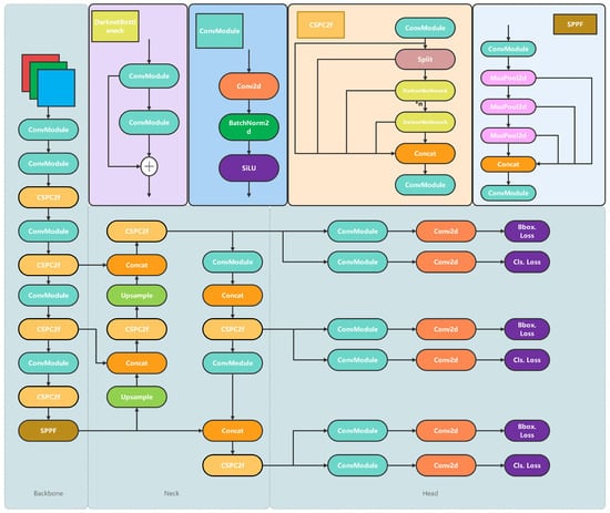 In 2023, the Ultralytics team advanced upon YOLOv5 to introduce the YOLOv8 object detection model. In the backbone component, YOLOv8 improves upon CSPNet by refining feature propagation and reducing computations, thereby enhancing the network’s ability to capture multi-scale features. The neck section of YOLOv8 comprises multiple layers that effectively integrate features from different scales. In the head section, unlike YOLOv5 which uses an anchor-based detection head, YOLOv8 adopts an anchor-free detection head. This anchor-free approach directly predicts the center and scale of objects, reducing the computational complexity and improving detection accuracy. The network architecture is depicted in Figure 6.