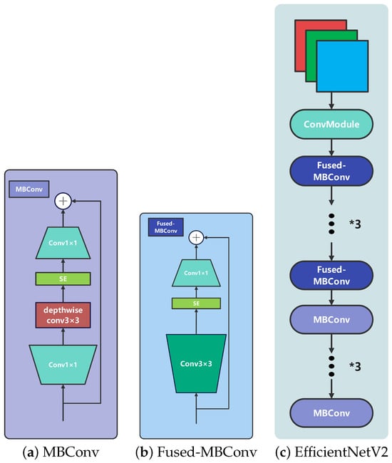 EfficientNetV2 architecture. In Figure (c), the asterisk (*) represents the multiplication operation.