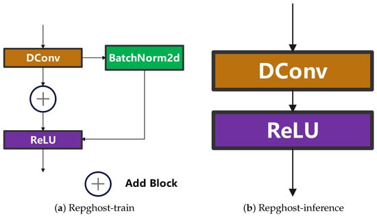 The RepGhost (Re-parameterization Ghost) module [42] is an improvement upon the Ghost module [43] through structural re-parameterization. It addresses the significant computational cost associated with concatenation operations on hardware devices while maintaining a certain level of model accuracy. The goal is to reduce the computational and parameter overhead of the module, thereby accelerating the network’s operation speed. The structure of the RepGhost module is illustrated in Figure 8.
