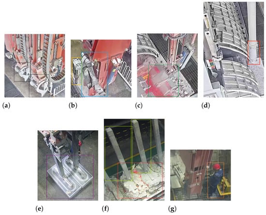 Categories of labels: (a) anode grabbing rod, (b) shell-breaking mechanisms, (c) bucket, (d) feeding pipe, (e) new anode, (f) anode station and old anode, and (g) person.