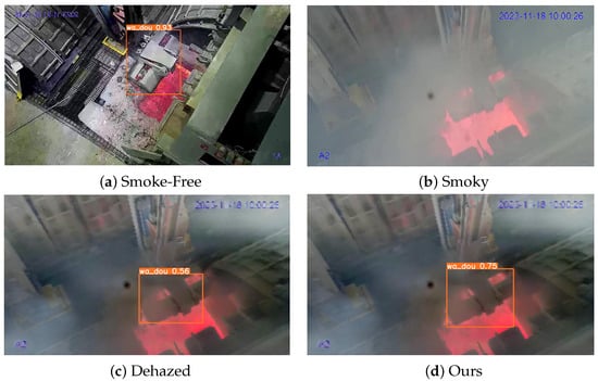 We select images from the same operational scene, including those with smoke, no smoke, and dehazing, to conduct inference using YOLOv8n. The results are illustrated in Figure 11. Through inference using the YOLOv8n model, it is observed that the YOLO model performs effectively in smoke-free scenarios but fails in smoky environments. However, after the dehazing treatment, the performance is restored.