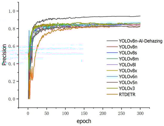 The experimental results indicate that compared to current mainstream detectors, YOLOv8n-Al-Dehazing exhibits superior performance when dealing with smoky data, showing improvements across key metrics. There is a significant reduction in FLOPs and parameters, achieving the best results in mAP and precision. Specifically, mAP improves by 7.6% compared to YOLOv3, and by 13.3% compared to YOLOv8n. For the DETR model, it outperforms RT-DETR by 11.0%. In terms of accuracy, as shown in Figure 12, YOLOv8n-Al-Dehazing improves by 7.7% over the original YOLOv8n, by 8.6% over RT-DETR, and is 4.1% higher than the most accurate model, YOLOv3, listed in the table. Additionally, YOLOv8n-Al-Dehazing achieves low computational complexity, reduced parameters, and the fastest object detection speed (FPS), effectively lowering the hardware requirements for deployment and meeting the real-time performance needs. Compared to YOLOv8, the parameters are reduced by 0.92 M and computations by 5.6 G. Through comparative experiments with advanced mainstream detectors, it is evident that our proposed YOLOv8n-Al-Dehazing meets our expectations, achieving higher accuracy and mAP on the aluminum electrolysis smoky dataset while significantly reducing parameters and computations, making it a suitable real-time object detector for smoky environments in aluminum electrolysis.
