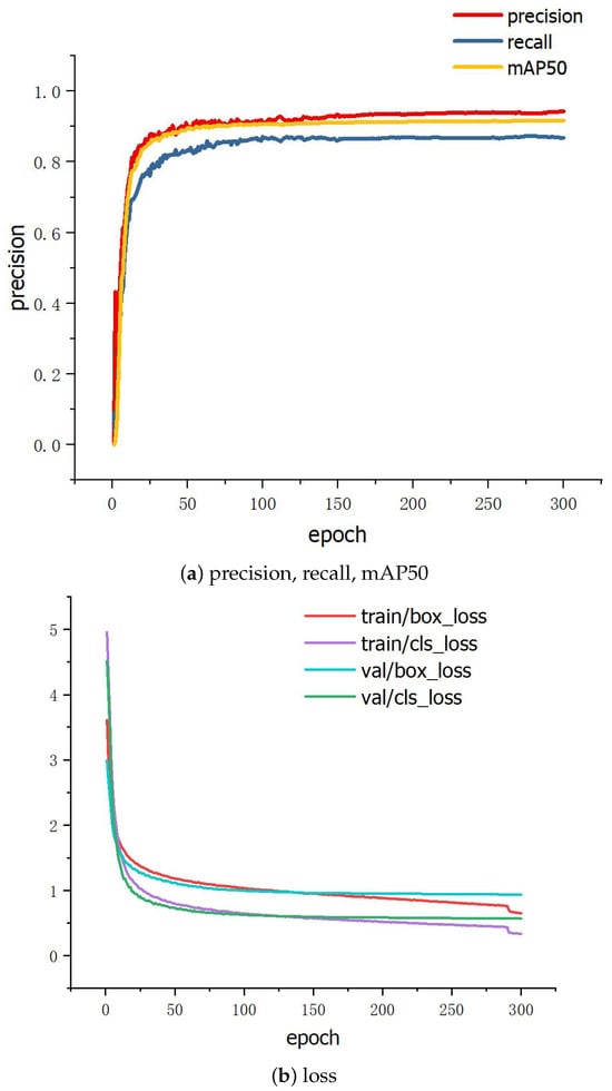 As shown in Figure 13, within the first 50 epochs, the values of precision, recall, and mAP50 are significantly increased while the loss function value is substantially decreased. After 80 epochs, the rate of improvement begins to slow down, and around 110 epochs, the training metrics stabilizes, indicating that the network model has largely converged.