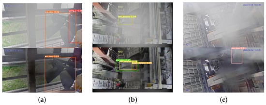(a) Misdetections by YOLOv8n due to smoke and dust in the upper image. (b,c) Missed detections by YOLOv8n due to smoke and dust in the upper images. The lower images display the inference results of our proposed YOLOv8n-Al-Dehazing.