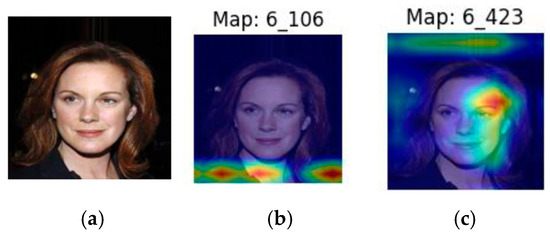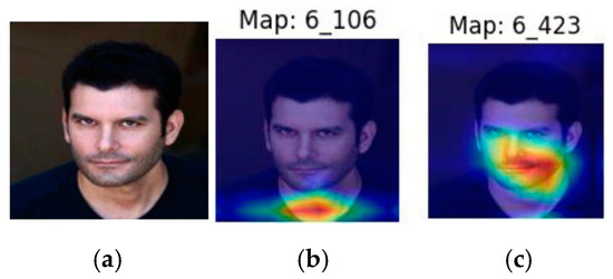 We now present a sample image for a man (sample 6) in Figure 5a and the two feature maps (106 and 423, containing non-zero values) superimposed on the sample image in Figure 5b and Figure 5c, respectively.