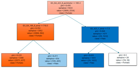 - Rule-2: If lip and left cheek perimeter is ≤105.305 and neck area is ≤710.5 then female, else male.