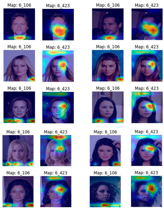 Figure 6 shows some major differences from Figure 5. Firstly, the location of feature maps is distinct from those of the male image. The female feature maps are located in three separate localities. Secondly, as shown in map 106, the upper shoulder area is highlighted, which captures the long hair of the woman. Map 106 also highlights another area, which is the lower neck, which was highlighted in the male image as well. We additionally see in map 106 an example of contour splitting with splits into three segments, as already described. Finally, we observe in map 423 that the distinctive female arched eyebrow is captured.