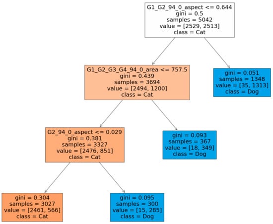 Figure 14 shows that the features derived from feature map 94 dominate the classification process. In fact, all of the divisions in the tree can be attributed to this single feature map. Figure 14 also reveals that the main distinguishing characteristic between dogs and cats is the shape of the face. Dogs tend to have a long and relatively narrow face, with a larger facial area than cats. On the other hand, cats are wider while being less long (smaller height), having a more rounded appearance. Despite cats having more rounded dimensions, overall, their aspect ratio is smaller than that of dogs on account of their smaller facial area. This leads to a division at the top of the tree, where the left branch having a smaller aspect ratio for map 94 breaks in favor of cats with a probability of 3694/5042, or 73.3%, while a higher ratio favors dogs. Amongst the subpopulation of animals having a smaller aspect ratio, a larger facial area separated dogs from cats with a probability of 90.1%.