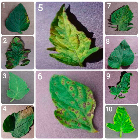 The tomato leaves dataset used is available in Kaggle [24]. This dataset contains about 11,000 images of tomato leaves, categorized into ten different classes, each representing a specific type of disease. Each class contains about 1100 images depicting symptoms of the respective disease. All disease types are shown in Figure 1, in accordance to the list below: