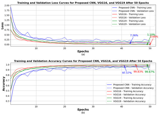 Further parameters, such as the inference speed and the computational requirements of each model, are also critical and should be taken into account. During training, the proposed CNN model demonstrated notable advantages in memory consumption and thermal efficiency compared to VGG16 and VGG19 architectures. The proposed CNN model needs 1.8 GB of RAM, while both VGG16 and VGG19 models require 33% more, i.e., 2.4 GB of RAM. Furthermore, regarding GPU temperature, the proposed CNN model maintained a stable range of 45–50 °C, ensuring lower hardware strain, while VGG16 and VGG19 models reached 65–70 °C, imposing a heavier computational load and increasing the risk of thermal throttling or long-term hardware degradation. The temperatures were recorded with an external laptop cooling fan to aid heat dissipation, particularly from the GPU. Without additional cooling, these temperatures could be even higher. Given that GPUs typically have a thermal limit of 90 °C, these differences highlight the efficiency of our proposed CNN in managing system resources. Another key advantage of the proposed CNN model is its faster training time per epoch, i.e., 62 s, compared to 80 and 95 s for VGG16 and VGG19, respectively. While the time differences per epoch may seem minor at first glance, they accumulate significantly over multiple training iterations. For instance, over 50 epochs, the proposed CNN reduces training time by approximately 15 min compared to VGG16 and 27.5 min compared to VGG19.