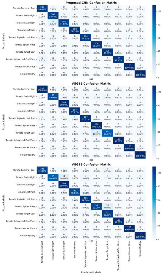 By comparing the three confusion matrices in Figure 4, we observe that overall, the proposed CNN model achieves the best classification performance across all classes. The VGG16 model follows closely, with only minor deviations from the proposed CNN, as indicated by the relatively small differences in misclassifications. On average, out of 110 images per class (with 10 belonging to a different category), the proposed CNN classifies approximately 105 images correctly, demonstrating strong predictive capability. However, the other two models show more noticeable classification errors for specific classes. For instance, in VGG16, the “Tomato Target Spot” is correctly classified 91 times, while the remaining 19 images are misclassified, with 12 of them incorrectly assigned to “Tomato Spider Mites” class. A similar issue arises with VGG19 model, where “Tomato Early Blight” is frequently confused with “Tomato Late Blight”, since only 89 images are correctly classified in “Tomato Early Blight”, while 11 are misclassified into “Tomato Late Blight”.
