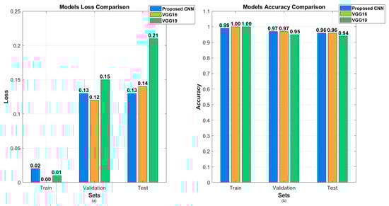 The graph in Figure 5 presents the average loss and accuracy across the training, validation, and test sets for each model. These results align with the training and validation curves in Figure 3, now quantified to provide exact evaluation rates.