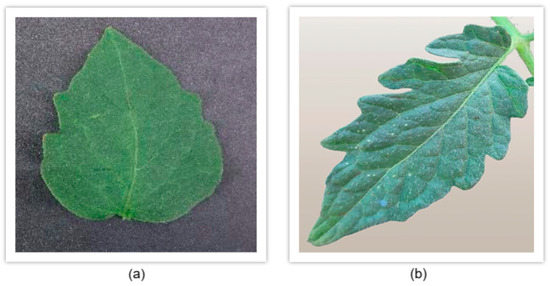 Figure 7. Comparison of tomato leaf morphology: (a) the left image shows a broader, thicker tomato leaf from the original dataset, (b) while the right image displays a thinner, narrower leaf from the custom dataset sourced in Greece.