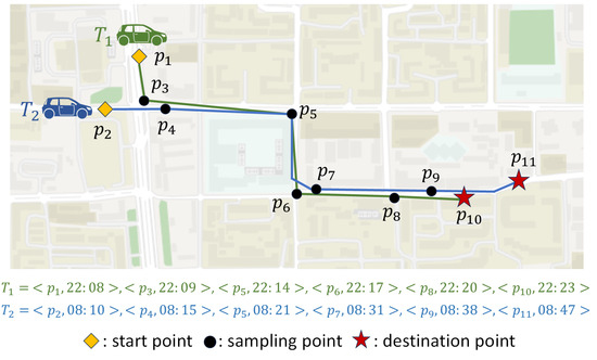 - Li, G.; Hung, C.C.; Liu, M.; Pan, L.; Peng, W.C.; Chan, S.H.G. Spatial-temporal similarity for trajectories with location noise and sporadic sampling. In Proceedings of the 2021 IEEE 37th International Conference on Data Engineering (ICDE), Chania, Greece, 19–22 April 2021; pp. 1224–1235. [Google Scholar]