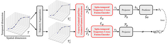 Given a spatio-temporal trajectory T, first obtain two different views ( and ) of T through the trajectory augmentation module. We employ trajectory down-sampling and trajectory distortion as augmentation methods. Furthermore, we adopt the latest trajectory truncation and simplification [29].