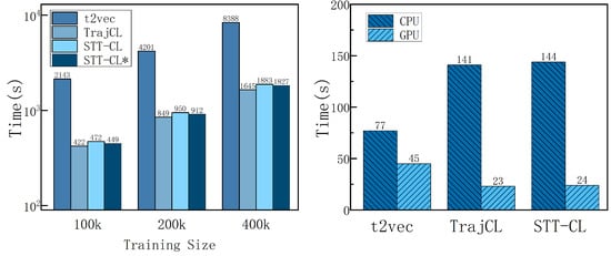 Testing time. To evaluate the testing efficiency of different models, we conducted experiments on the Porto dataset using a fixed query set of size 1 k and search database D of size 100 k. We measured the time taken by each model to compute the trajectory similarities between the query and the search dataset. The results showed that t2vec performed better on the CPU, exhibiting faster testing times compared to STT-CL and TrajCL. However, on the GPU, t2vec exhibited slower testing times. This is due to the recursive matrix computations involved in t2vec, which are less optimized for parallel computation on GPU. The testing time for STT-CL and TrajCL did not show significant differences on either CPU or GPU. Despite the overall increased computational cost of the STT-CL model, this difference during testing is not noticeable when handling smaller query sets and datasets.