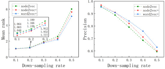 The results reveal that the robustness of the node2vec method substantially increases following optimization. Additionally, the ‘node2vec+’ approach exhibits superior performance to the ‘word2vec+’ method when the down-sampling rate is below 0.2; however, its effectiveness diminishes at higher down-sampling rates. This phenomenon is attributed to high-quality trajectories more accurately representing trajectory similarities through spatial–temporal proximity relations, whereas low-quality trajectories more effectively convey similarity through spatial semantic relationships embedded in historical trajectories.